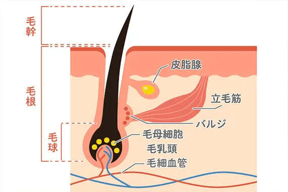 毛乳頭(もうにゅうとう):毛細血管から栄養を取り込み、毛の成長を指令する「司令塔」。