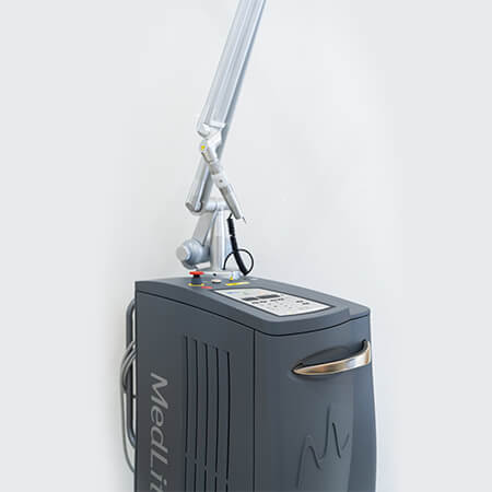 当院では、太田母斑の治療法として最も効果的な「QスイッチYAGレーザー」と、最新の「ピコレーザー」の両方を導入しています。どちらも厚生労働省に認可された保険適応の機器です。頑固な深い色素にはスイッチレーザー、肌ダメージを抑えたい段階ではピコレーザーといった、皮膚科・形成外科的視点での使い分けが可能です。